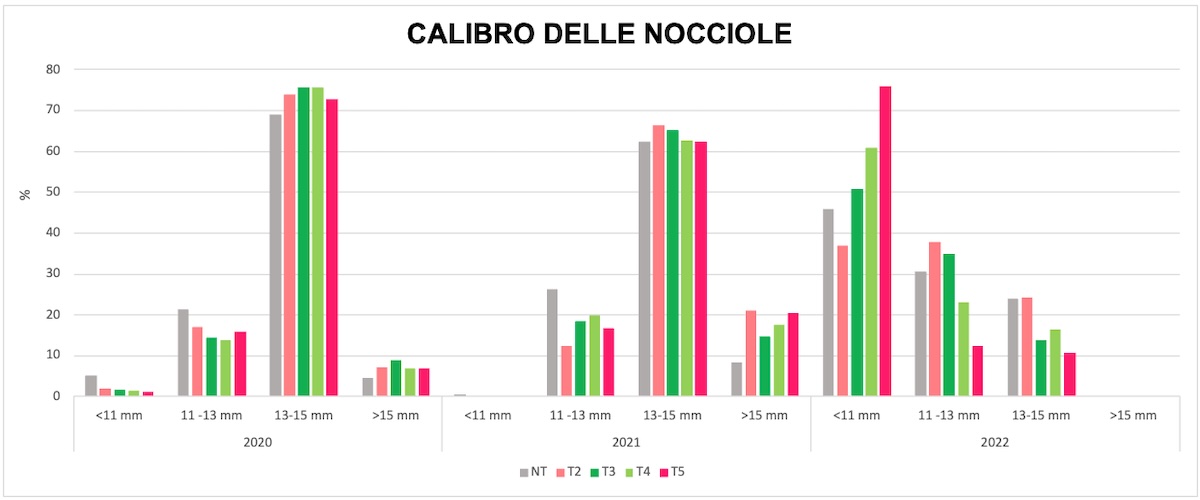 Durante i primi due anni di prova, le tesi Unimer (T3 e T4) hanno mostrato calibri delle nocciole comparabili a quelli delle tesi T2 e T5. Nel terzo anno, le condizioni climatiche avverse hanno provocato una significativa riduzione del calibro dei frutti; nonostante il calo generalizzato, le tesi concimate con concimi organici e organo-minerali hanno continuato a garantire un calibro medio più elevato rispetto alla tesi T5, come mostrato in Figura 3.