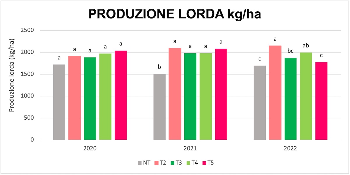 Figura 2. Produzione lorda in kg/ha delle tesi in prova (NT non trattato, T2 standard aziendale, T3 concimazione organo-minerale Unimer, T4 concimazione Bio Unimer, T5 fertilizzazione chimica) nelle 3 annate di studio. Le lettere minuscole indicano la differenza significativa tra i trattamenti nell'anno (P<0,05).