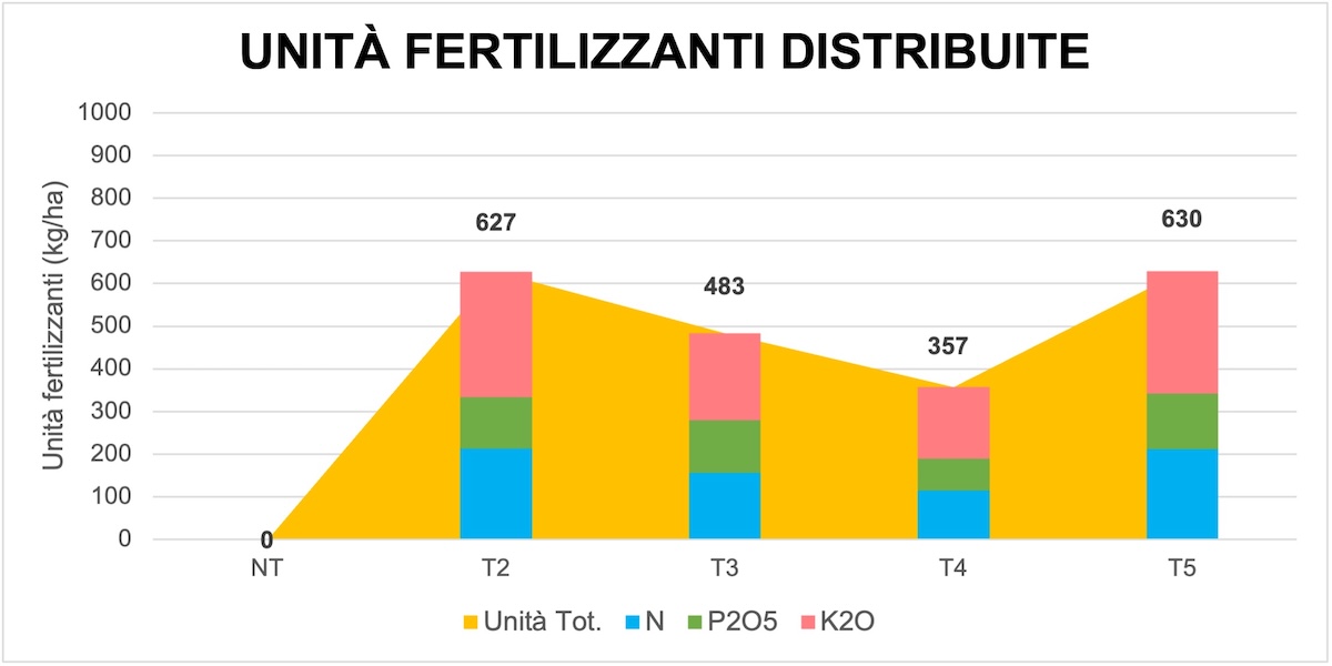 Per la tesi trattata con fertilizzanti organo-minerali Unimer, le unità fertilizzanti di azoto e potassio sono state ridotte del 30%, grazie alla maggiore efficienza di questa tipologia di prodotti rispetto ai concimi di sintesi. Nella tesi relativa ai fertilizzanti Unimer ammessi in agricoltura biologica, la riduzione è stata ancora più marcata: fosforo diminuito del 45% rispetto alle altre tesi e azoto somministrato in quantità inferiore del 40% rispetto sia alla tesi aziendale che a quella con fertilizzanti di sintesi. Questo approccio è stato possibile grazie al più alto rendimento nutrizionale della forma organica dell'azoto.