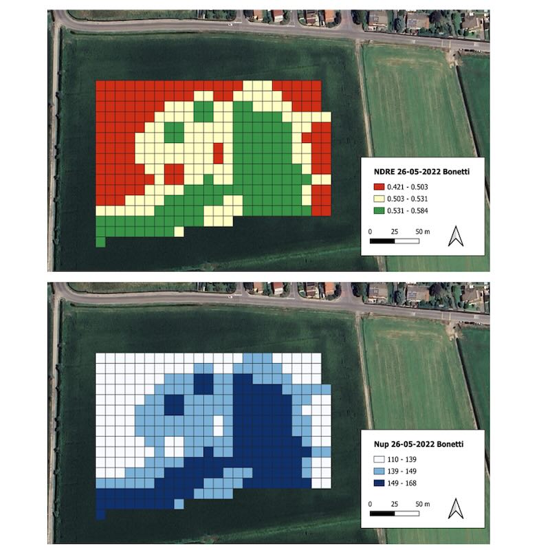 Mappa della variabilità spaziale derivata da satellite tramite indice Ndre (sopra); mappa della variabilità dell'azoto asportato allo stadio di 8 foglie (sotto)