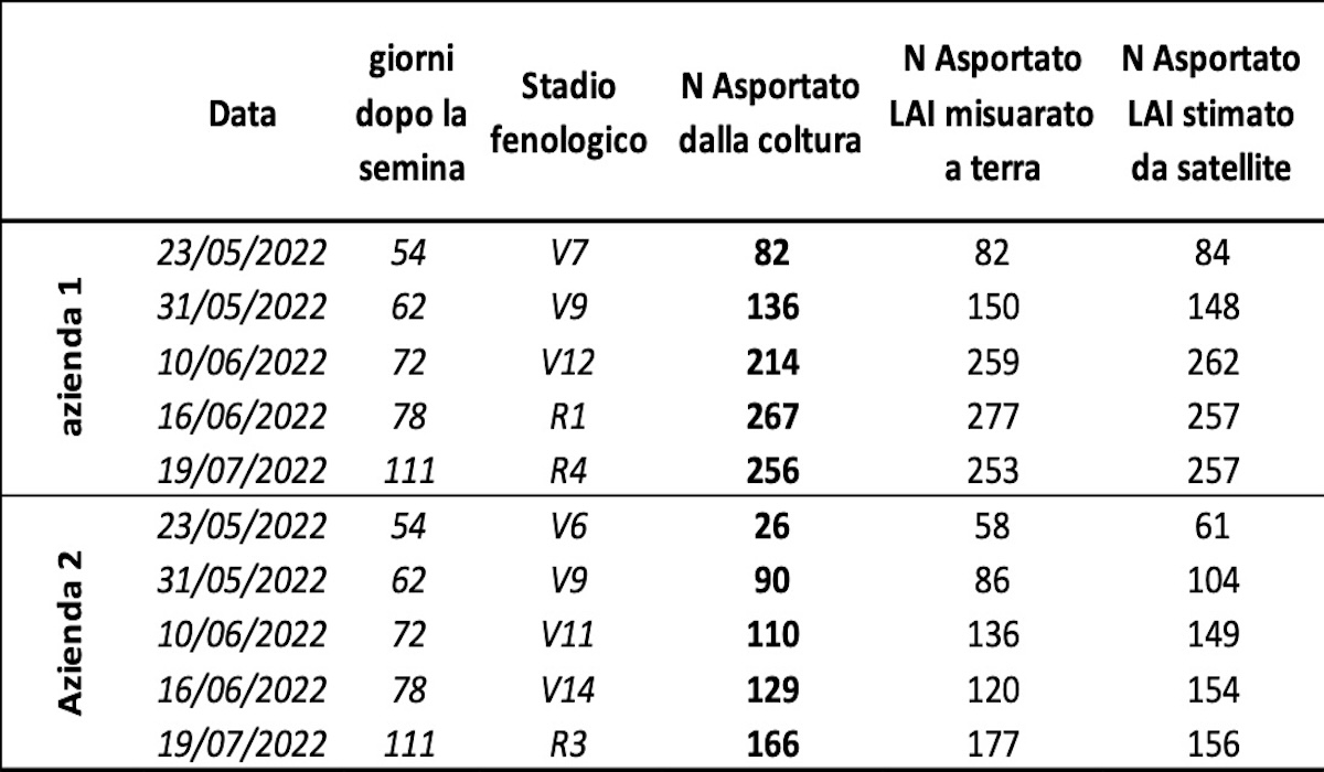 Tramite l'indice vegetazionale (Ndre) derivato da immagini satellitari è stato possibile stimare il Lai, che essendo correlato alla quantità di azoto presente nelle foglie e nei culmi fornisce l'informazione di interesse agronomico, cioè l'asportazione di azoto della coltura. Questo approccio permette all'agricoltore di determinare la dose di azoto da applicare, basandosi sulla risposta colturale alla variabilità spaziale e temporale della stagione. In questo modo, è possibile calibrare la dose tecnica ottimale (Dto) per massimizzare la resa e la dose economica ottimale (Deo) per ottimizzare la redditività economica della coltura.
